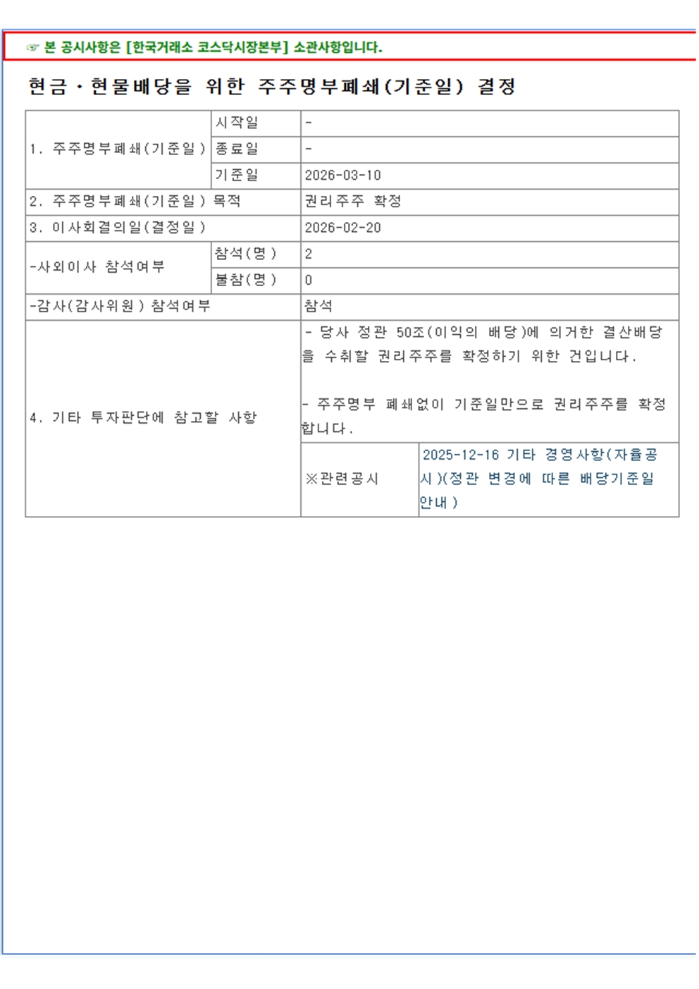 | 39 | 현금 현물배당을 위한 주주명부폐쇄(기준일... | 2026.02.24 | 399 |
